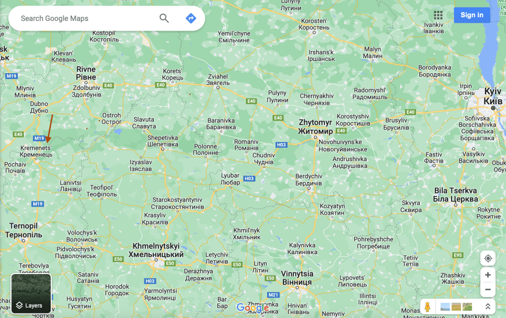 Map of central Ukraine showing Kremenets under red arrow.