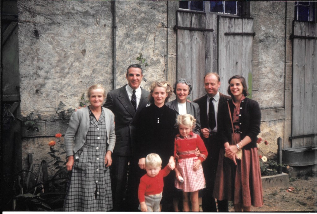 My grandfather (the taller man in the grey suit) wrote a memoir about his World War II experiences in eastern France. His name was Waller B. Booth, and my mother (on the far right) is his daughter. The memoir called Mission Marcel Proust: The Story of an Unusual OSS Undertaking recounts grandfather’s adventures behind German lines leading a group of US and French intelligence agents. The group parachuted in the middle of the night in September 1944 into a field outside the village of Confracourt. Once on the ground, he linked up with the local French resistance, called the maquis. Working with a battalion of Ukrainian soldiers who had recently switched from the German to French side, grandfather and the maquis defeated German assaults on woods where they were camped and liberated Confracourt. Though Confracourt was just a week during his two-month mission in France, memories of his time there and friends made stayed with him throughout his life. He took several trips back, including one in 1953 during which the photo was taken.