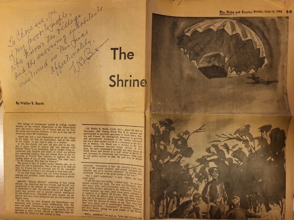 Grandfather believed he owed his life to a member of the local maquis Andre Bazeau, who was captured, tortured and killed by the Gestapo in mid-September 1944. Bazeau refused to give up the details of grandfather’s secret mission, and for that he paid with his life. Here’s an excerpt from a newspaper article my grandfather wrote about Andre Bazeau in 1964.